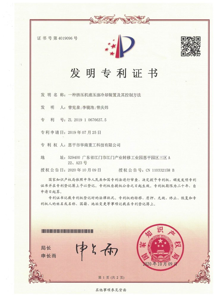 Certificate of Patent for Utility Model (Enping Heavy Industry No.ZS1913895-2-FS) of A Hydraulic Oil Supply Device